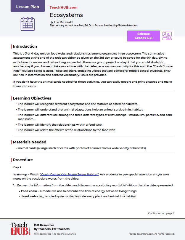 This is a 3 or 4-day unit on food webs and relationships among organisms in an ecosystem. The summative assessment at the end of the unit can either be given on the 3rd day or could be saved for the 4th day, giving extra time for review and re-teaching as needed. There is a group project on day 3 that you could stretch to another day if you choose to take more time with that. Also, as a warm-up activity for this unit, the “Crash Course Kids” YouTube series is used. These are short, engaging videos that are perfect for middle school students. They are rich in information and content vocabulary. Links are provided.