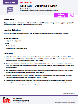 Do you ever wish your little sister would stay out of your room? This lesson will give you the opportunity to apply your scientific ideas to design a latch to keep your door shut!