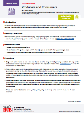 Students will identify examples of consumers and producers in their community by examining a variety of pictures. They will then ask and answer questions about key details while working with a peer.