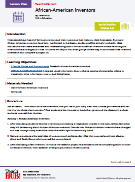 Most people have heard of famous inventors and their inventions that make our daily lives easier. But many African-American inventors have been overlooked. In this lesson, students will be actively involved in class discussions that create awareness and understanding about African-American inventors whose technological inventions have changed our lives. Students will be put into small groups where they must choose three inventors to research and complete a project on.