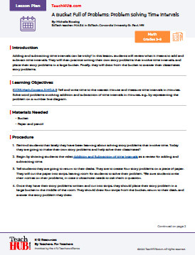 Adding and subtracting time intervals can be tricky! In this lesson, students will review what it means to add and subtract time intervals. They will then practice writing their own story problems that involve time intervals, and place their story problems in a large bucket. Finally, they will draw from the bucket to answer their classmates story problems.