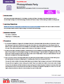 Let’s have a photosynthesis party! In this lesson, students will learn the steps of photosynthesis and how it converts light energy into chemical energy. Students will have a “party” while creating models in small groups.