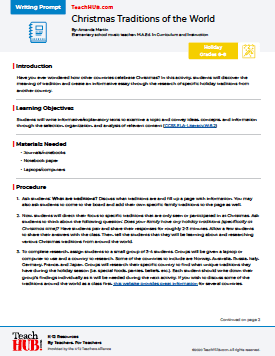 Have you ever wondered how other countries celebrate Christmas? In this activity, students will discover the meaning of tradition and create an informative essay through the research of specific holiday traditions from another country.