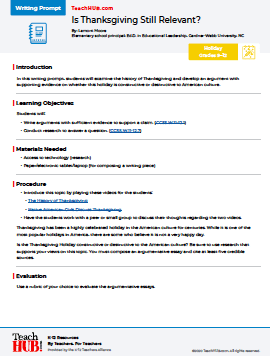In this writing prompt, students will examine the history of Thanksgiving and develop an argument with supporting evidence on whether this holiday is constructive or destructive to American culture.