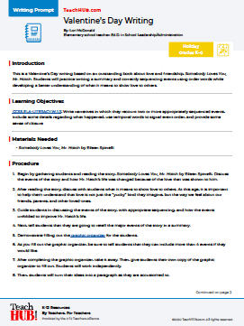 This is a Valentine’s Day writing based on an outstanding book about love and friendship, Somebody Loves You, Mr. Hatch. Students will practice writing a summary and correctly sequencing events using order words while developing a better understanding of what it means to show love to others.