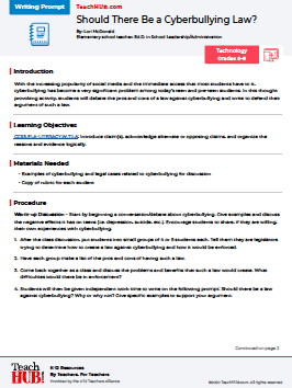With the increasing popularity of social media and the immediate access that most students have to it, cyberbullying has become a very significant problem among today’s teen and pre-teen students. In this thought provoking activity, students will debate the pros and cons of a law against cyberbullying and write to defend their argument of such a law.