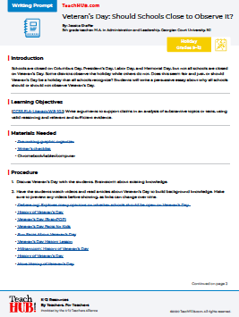 Schools are closed on Columbus Day, President’s Day, Labor Day, and Memorial Day, but not all schools are closed on Veteran’s Day. Some districts observe the holiday while others do not. Does this seem fair and just, or should Veteran’s Day be a holiday that all schools recognize? Students will write a persuasive essay about why all schools should or should not observe Veteran’s Day.
