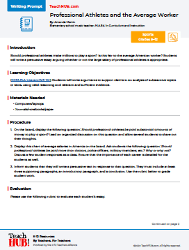 Should professional athletes make millions to play a sport? Is this fair to the average American worker? Students will write a persuasive essay arguing whether or not the large salary of professional athletes is appropriate.
